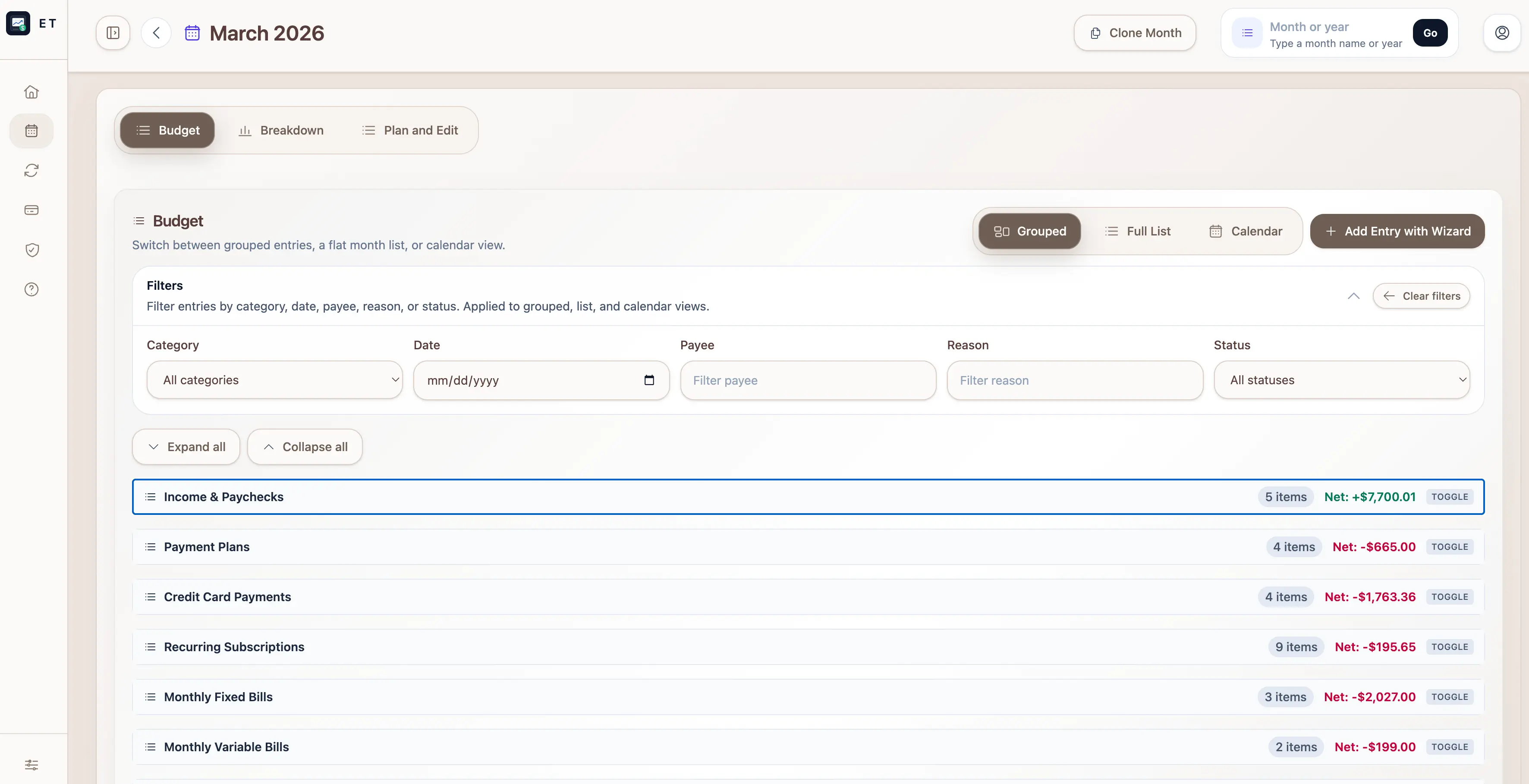 - Months are reviewed through Budget, Breakdown, and Plan and Edit, with Grouped, Full List, and Calendar modes inside Budget.