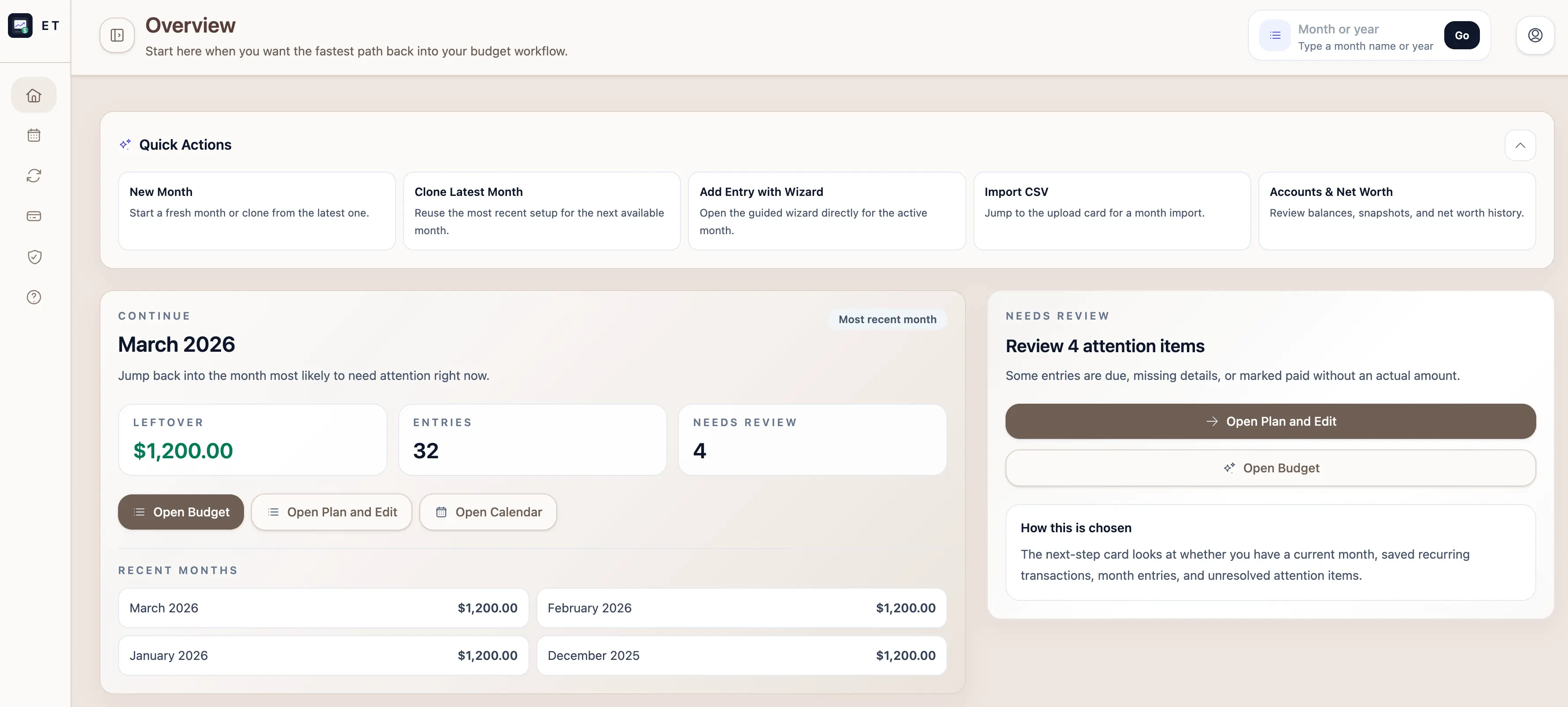 It supports month creation and cloning, recurring transactions, guided Plan and Edit actions, guided and manual entry editing, Budget and Breakdown review flows, backup and restore, dashboard guidance, and manual account and net worth tracking.