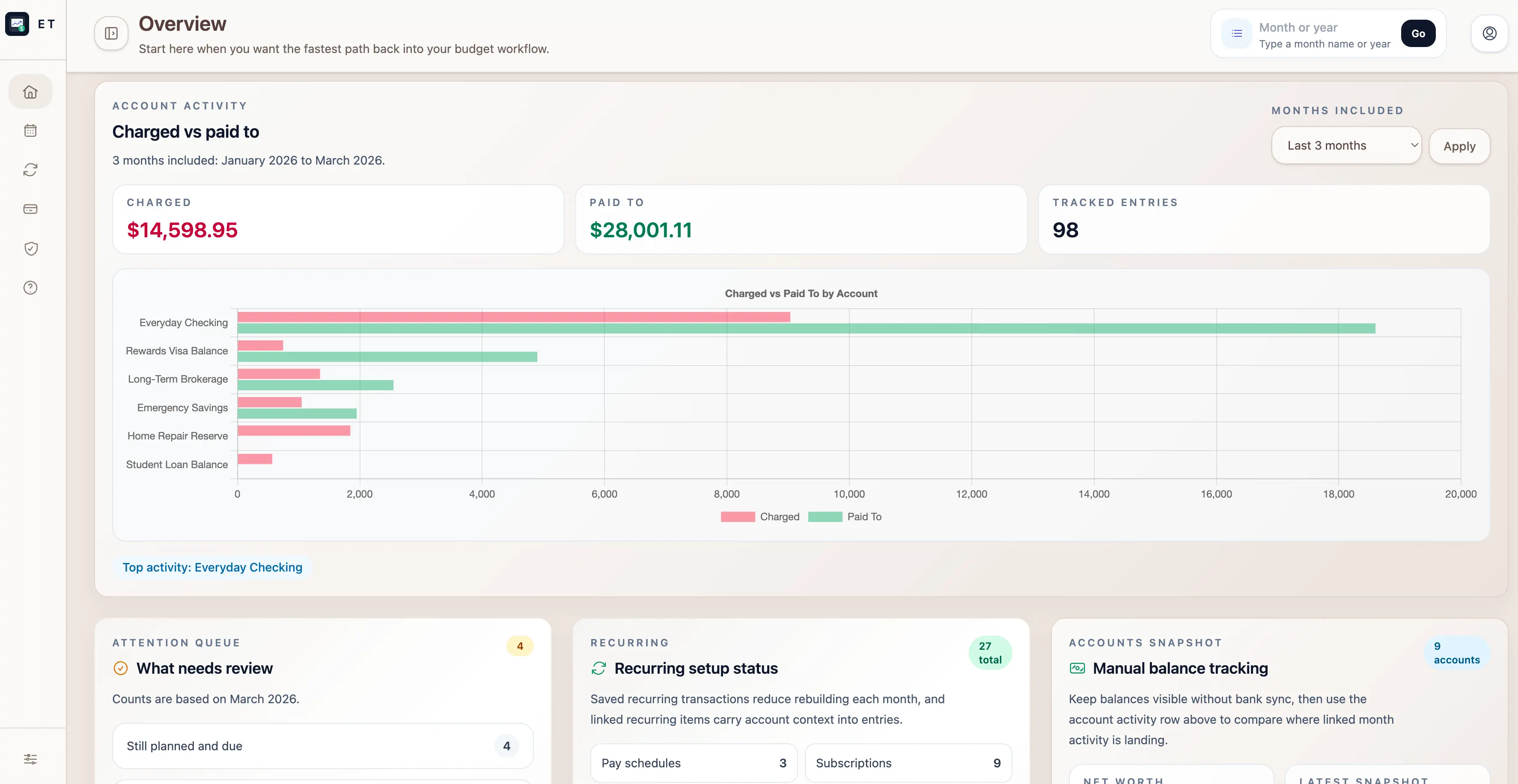 Link recurring items to the accounts they affect, track balance snapshots in the same place, and review charged-versus-paid activity by account over recent months.